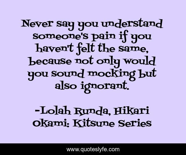 This page presents the quote "Never say you understand someone's pain if you haven't felt the same, because not only would you sound mocking but also ignorant.". Author of this quote is Lolah Runda, Hikari Okami: Kitsune Series. This quote is about empathy, pain, love, self-realization, sadness, inspirational, self-motivation, enthusiasm, sad-but-true,.