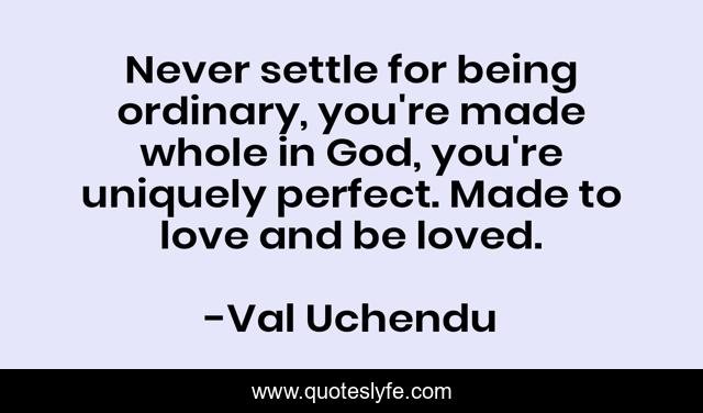 This page presents the quote "Never settle for being ordinary, you're made whole in God, you're uniquely perfect. Made to love and be loved.". Author of this quote is Val Uchendu. This quote is about confidence, love, god, motivational, loss-of-love, self-worth, ordinary-courage, heartbreak, optimistic,.