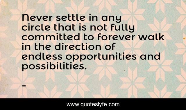 This page presents the quote "Never settle in any circle that is not fully committed to forever walk in the direction of endless opportunities and possibilities.". Author of this quote is . This quote is about endless-opportunities, fully-committed-individuals, edmond-mbiaka, company, possibilities, circle,.