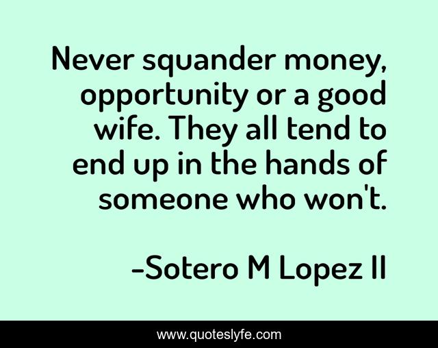 "Sotero M Lopez II Quotes." Quoteslyfe.com, 2025. Sat. 06 Dec. 2025. <https://www.quoteslyfe.com/quote/Never-squander-money-opportunity-or-a-good-80370>.