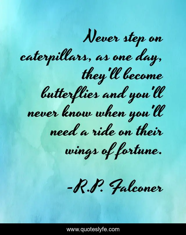 This page presents the quote "Never step on caterpillars, as one day, they'll become butterflies and you'll never know when you'll need a ride on their wings of fortune.". Author of this quote is R.P. Falconer. This quote is about inspirational-life, life-philosophy, humility, inspirational, enthusiasm,.