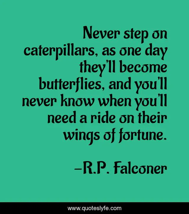 This page presents the quote "Never step on caterpillars, as one day they'll become butterflies, and you'll never know when you'll need a ride on their wings of fortune.". Author of this quote is R.P. Falconer. This quote is about inspirational-life, enthusiasm, inspirational, humility,.