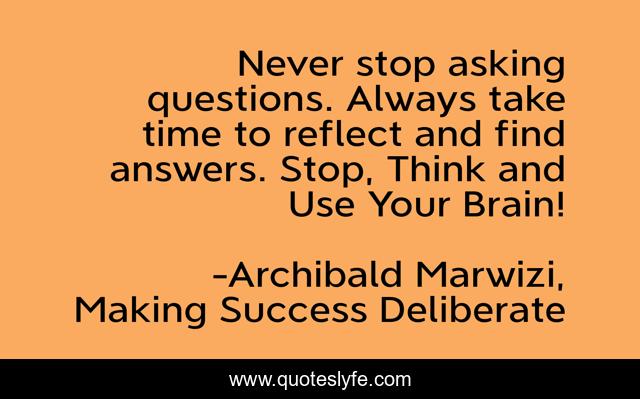 This page presents the quote "Never stop asking questions. Always take time to reflect and find answers. Stop, Think and Use Your Brain!". Author of this quote is Archibald Marwizi, Making Success Deliberate. This quote is about life, success, behaviour, attitude, legacy, growth, purpose, inspirational, leadership,.