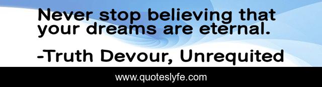 This page presents the quote "Never stop believing that your dreams are eternal.". Author of this quote is Truth Devour, Unrequited. This quote is about faith, love, soul-mates, wish, unrequited, hope, romance, sated, dreams,.