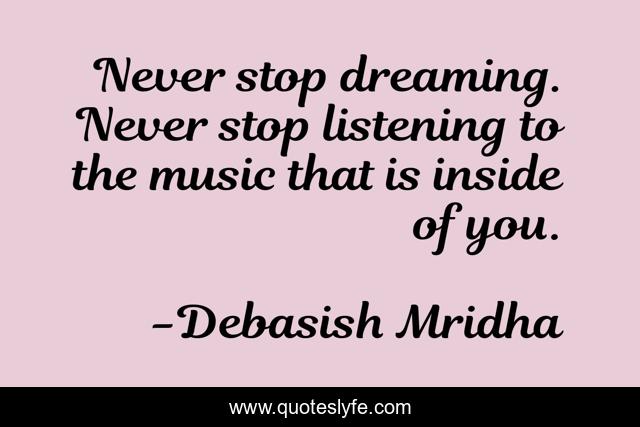 This page presents the quote "Never stop dreaming. Never stop listening to the music that is inside of you.". Author of this quote is Debasish Mridha. This quote is about never-stop-dreaming, philosophy, debasish-mridha, quotes, music, inspirational, dreaming, enthusiasm, debasish-mridha-m-d,.