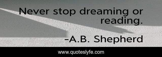 This page presents the quote "Never stop dreaming or reading.". Author of this quote is A.B. Shepherd. This quote is about life, reading, hope, life-and-living, dreams, inspiration,.