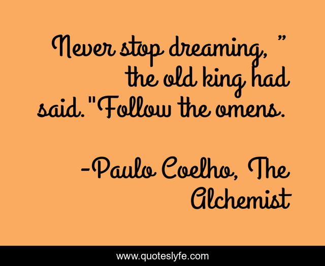 This page presents the quote "Never stop dreaming, ” the old king had said."Follow the omens.". Author of this quote is Paulo Coelho, The Alchemist. .