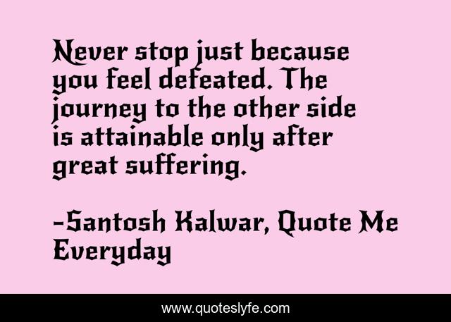 This page presents the quote "Never stop just because you feel defeated. The journey to the other side is attainable only after great suffering.". Author of this quote is Santosh Kalwar, Quote Me Everyday. This quote is about life, stop, suffering, journey, defeat, other-side, attainable,.