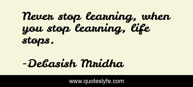 This page presents the quote "Never stop learning, when you stop learning, life stops.". Author of this quote is Debasish Mridha. This quote is about life, love, knowledge, inspirational, intelligence, philosophy, wisdom, quotes, affection,.
