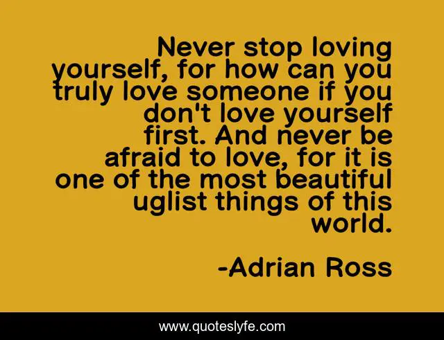 This page presents the quote "Never stop loving yourself, for how can you truly love someone if you don't love yourself first. And never be afraid to love, for it is one of the most beautiful uglist things of this world.". Author of this quote is Adrian Ross. This quote is about relationships, love, yourself, romance, inspirational, enthusiasm, affection,.