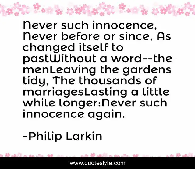 "Philip Larkin Quotes." Quoteslyfe.com, 2025. Fri. 05 Dec. 2025. <https://www.quoteslyfe.com/quote/Never-such-innocence-Never-before-or-since-52309>.