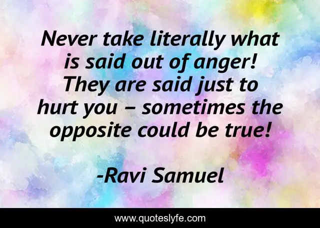 This page presents the quote "Never take literally what is said out of anger! They are said just to hurt you – sometimes the opposite could be true!". Author of this quote is Ravi Samuel. This quote is about anger, aggession, anger-management,.