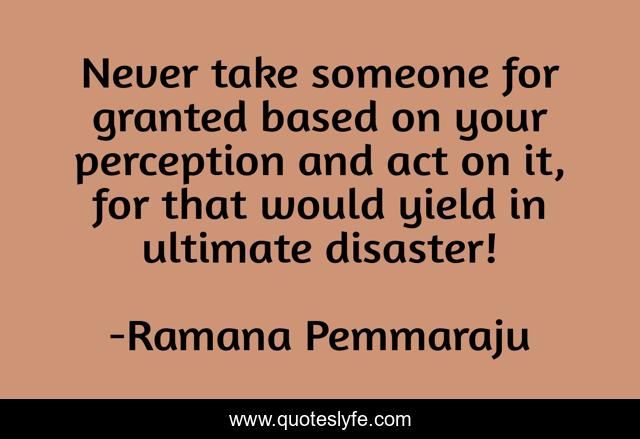 This page presents the quote "Never take someone for granted based on your perception and act on it, for that would yield in ultimate disaster!". Author of this quote is Ramana Pemmaraju. This quote is about disaster, perception-of-reality, feelings, difference-of-opinion, people-relations, thoughts, mindset,.