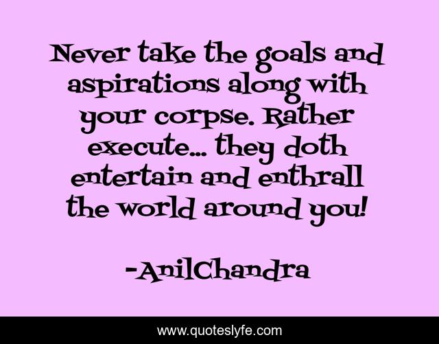 This page presents the quote "Never take the goals and aspirations along with your corpse. Rather execute... they doth entertain and enthrall the world around you!". Author of this quote is AnilChandra. This quote is about life, death, pain, sarcasm, motivational, confidence, optimistic, inspirational, positive,.