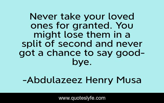 This page presents the quote "Never take your loved ones for granted. You might lose them in a split of second and never got a chance to say good-bye.". Author of this quote is Abdulazeez Henry Musa. .