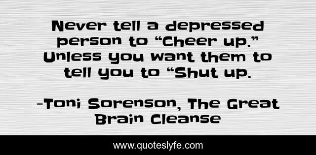 This page presents the quote "Never tell a depressed person to “Cheer up.” Unless you want them to tell you to “Shut up.". Author of this quote is Toni Sorenson, The Great Brain Cleanse. .