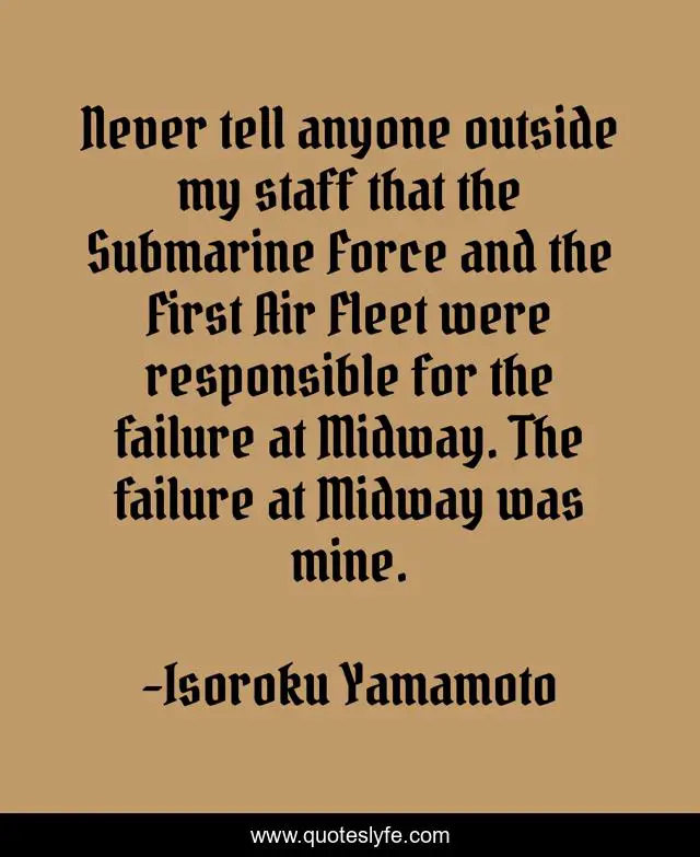 This page presents the quote "Never tell anyone outside my staff that the Submarine Force and the First Air Fleet were responsible for the failure at Midway. The failure at Midway was mine.". Author of this quote is Isoroku Yamamoto. This quote is about responsible, first,.