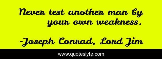 This page presents the quote "Never test another man by your own weakness.". Author of this quote is Joseph Conrad, Lord Jim. This quote is about test, weakness, weaknesses, man,.