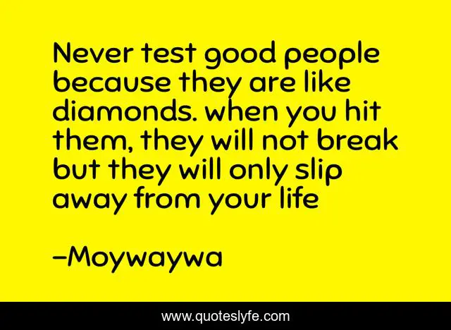 This page presents the quote "Never test good people because they are like diamonds. when you hit them, they will not break but they will only slip away from your life". Author of this quote is Moywaywa. This quote is about life-lesson, life-experience, love, life-lessons, affection,.