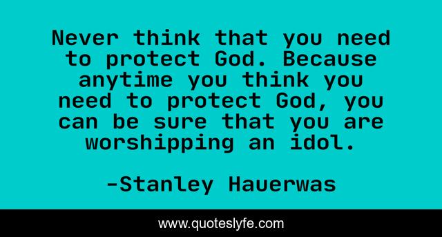 This page presents the quote "Never think that you need to protect God. Because anytime you think you need to protect God, you can be sure that you are worshipping an idol.". Author of this quote is Stanley Hauerwas. .