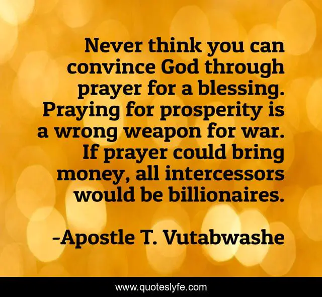 This page presents the quote "Never think you can convince God through prayer for a blessing. Praying for prosperity is a wrong weapon for war. If prayer could bring money, all intercessors would be billionaires.". Author of this quote is Apostle T. Vutabwashe. This quote is about prosperity, life, wealth, god, blessing, jesus,.