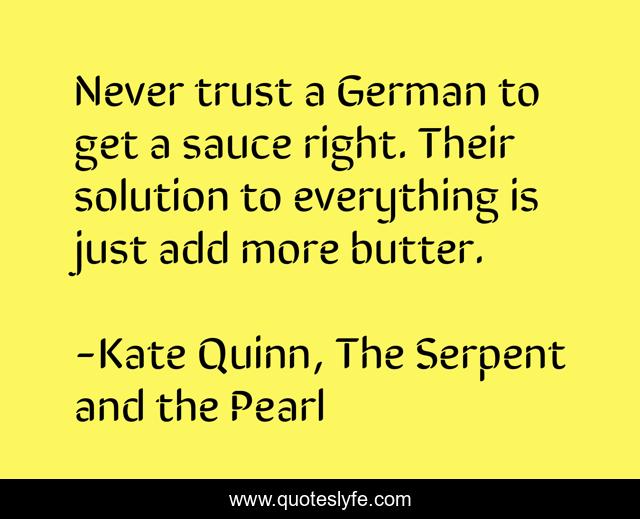 This page presents the quote "Never trust a German to get a sauce right. Their solution to everything is just add more butter.". Author of this quote is Kate Quinn, The Serpent and the Pearl. This quote is about food, culture, humor,.