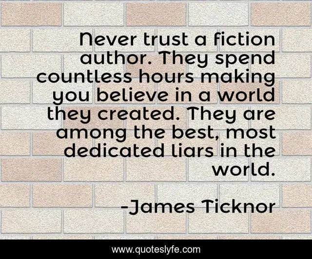 This page presents the quote "Never trust a fiction author. They spend countless hours making you believe in a world they created. They are among the best, most dedicated liars in the world.". Author of this quote is James Ticknor. This quote is about quote, humor, inspirational, enthusiasm,.