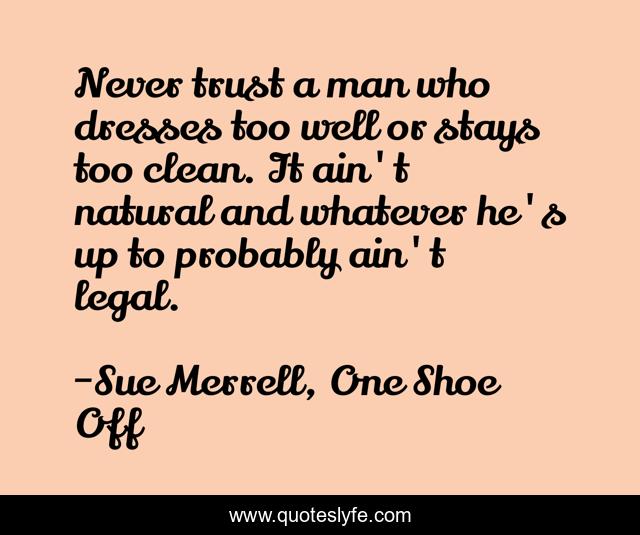 This page presents the quote "Never trust a man who dresses too well or stays too clean. It ain't natural and whatever he's up to probably ain't legal.". Author of this quote is Sue Merrell, One Shoe Off. This quote is about trust, natural, clean, legal, well-dressed,.