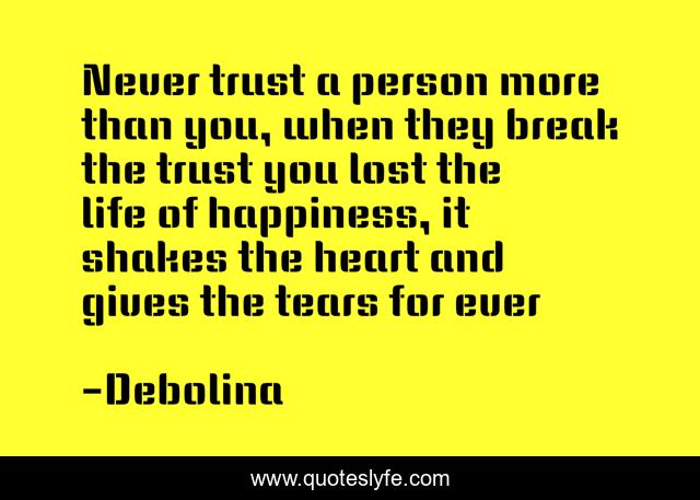 This page presents the quote "Never trust a person more than you, when they break the trust you lost the life of happiness, it shakes the heart and gives the tears for ever". Author of this quote is Debolina. .