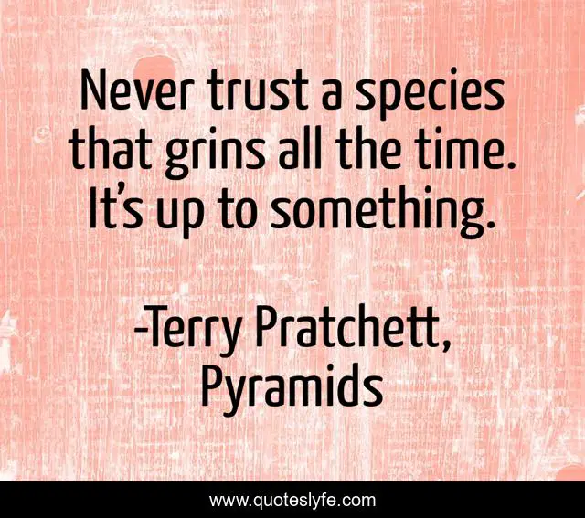 "Terry Pratchett, Pyramids Quotes." Quoteslyfe.com, 2025. Tue. 09 Dec. 2025. <https://www.quoteslyfe.com/quote/Never-trust-a-species-that-grins-all-55527>.