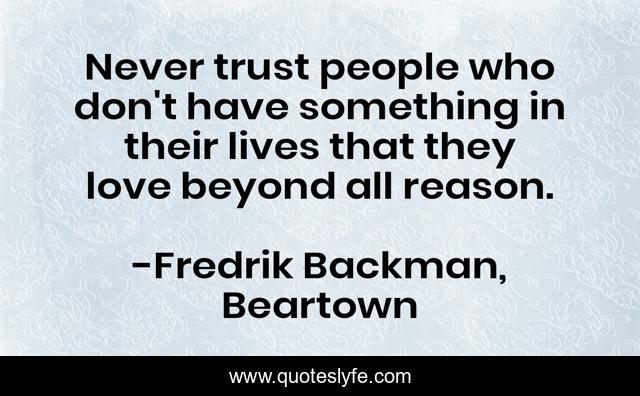 This page presents the quote "Never trust people who don't have something in their lives that they love beyond all reason.". Author of this quote is Fredrik Backman, Beartown. This quote is about love, trust, passion, affection,.