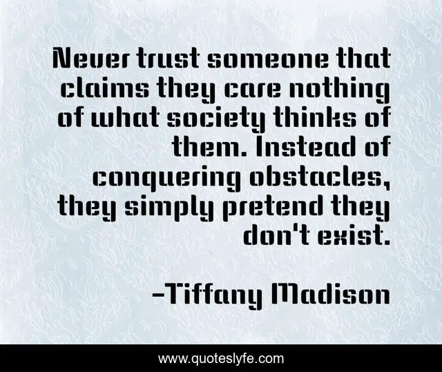 This page presents the quote "Never trust someone that claims they care nothing of what society thinks of them. Instead of conquering obstacles, they simply pretend they don't exist.". Author of this quote is Tiffany Madison. This quote is about pretend, overcoming, society, pretentiousness, trust, trustworthiness, overcoming-obstacles, vanity,.