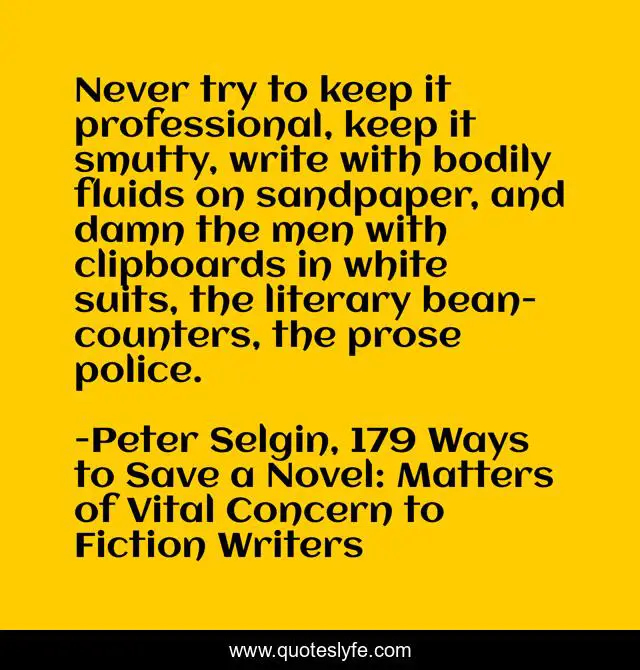 "Peter Selgin, 179 Ways to Save a Novel: Matters of Vital Concern to Fiction Writers Quotes." Quoteslyfe.com, 2025. Fri. 05 Dec. 2025. <https://www.quoteslyfe.com/quote/Never-try-to-keep-it-professional-keep-219284>.