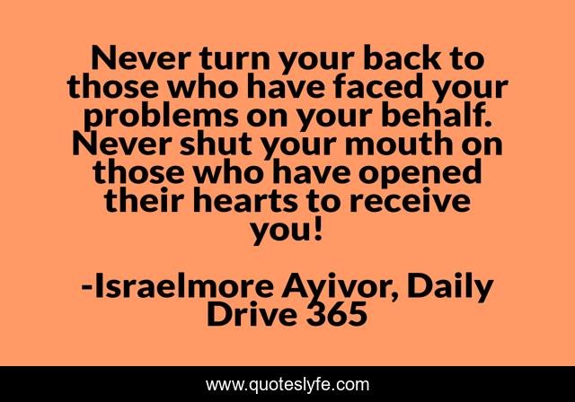 This page presents the quote "Never turn your back to those who have faced your problems on your behalf. Never shut your mouth on those who have opened their hearts to receive you!". Author of this quote is Israelmore Ayivor, Daily Drive 365. This quote is about heart, thanks, grateful, keep-quiet, food-for-thought, shut-your-mouth, thank, shut-up, reject-people,.