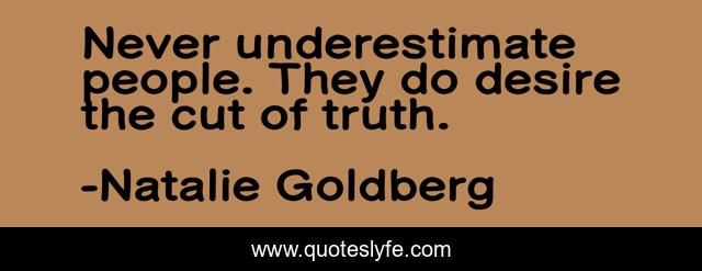 This page presents the quote "Never underestimate people. They do desire the cut of truth.". Author of this quote is Natalie Goldberg. This quote is about underestimate, people,.