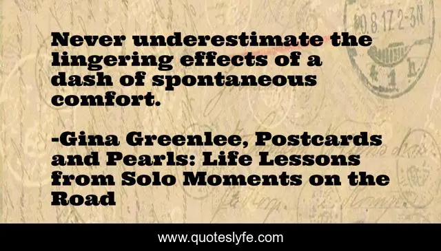 This page presents the quote "Never underestimate the lingering effects of a dash of spontaneous comfort.". Author of this quote is Gina Greenlee, Postcards and Pearls: Life Lessons from Solo Moments on the Road. This quote is about spontaneous-comfort, comfort, reaching-out, reaching-out-to-others, comforting, comfort-others, spontaneous-joy,.