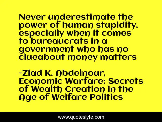 This page presents the quote "Never underestimate the power of human stupidity, especially when it comes to bureaucrats in a government who has no clueabout money matters". Author of this quote is Ziad K. Abdelnour, Economic Warfare: Secrets of Wealth Creation in the Age of Welfare Politics. This quote is about money, bureaucrats, stupidity, power, government,.