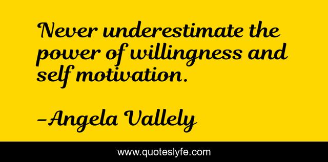 This page presents the quote "Never underestimate the power of willingness and self motivation.". Author of this quote is Angela Vallely. This quote is about confidence, willingness, positive, motivational, courage, optimistic, inspirational, self-motivation, enthusiasm,.