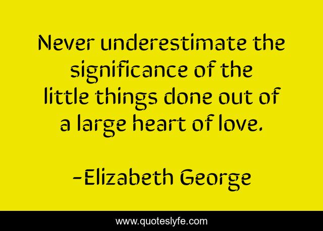 This page presents the quote "Never underestimate the significance of the little things done out of a large heart of love.". Author of this quote is Elizabeth George. This quote is about heart, little, love, family, home, god, place, underestimate, things,.