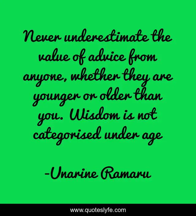 This page presents the quote "Never underestimate the value of advice from anyone, whether they are younger or older than you. Wisdom is not categorised under age". Author of this quote is Unarine Ramaru. This quote is about lessons, advice, listening, value, wisdom,.