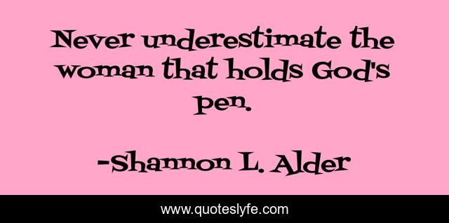 This page presents the quote "Never underestimate the woman that holds God's pen.". Author of this quote is Shannon L. Alder. This quote is about payback, warrior, writers, daughter-of-god, truth,.