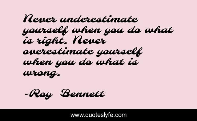 This page presents the quote "Never underestimate yourself when you do what is right. Never overestimate yourself when you do what is wrong.". Author of this quote is Roy Bennett. This quote is about life, wisdom-inspirational, wisdom, living-life, inspirational, enthusiasm, inspiration,.