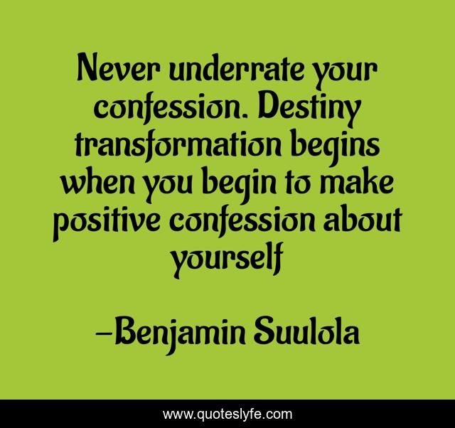 This page presents the quote "Never underrate your confession. Destiny transformation begins when you begin to make positive confession about yourself". Author of this quote is Benjamin Suulola. This quote is about positive-confession, destiny, transformation,.