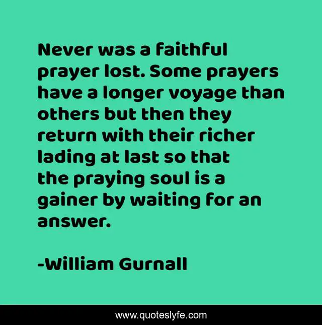 This page presents the quote "Never was a faithful prayer lost. Some prayers have a longer voyage than others but then they return with their richer lading at last so that the praying soul is a gainer by waiting for an answer.". Author of this quote is William Gurnall. .