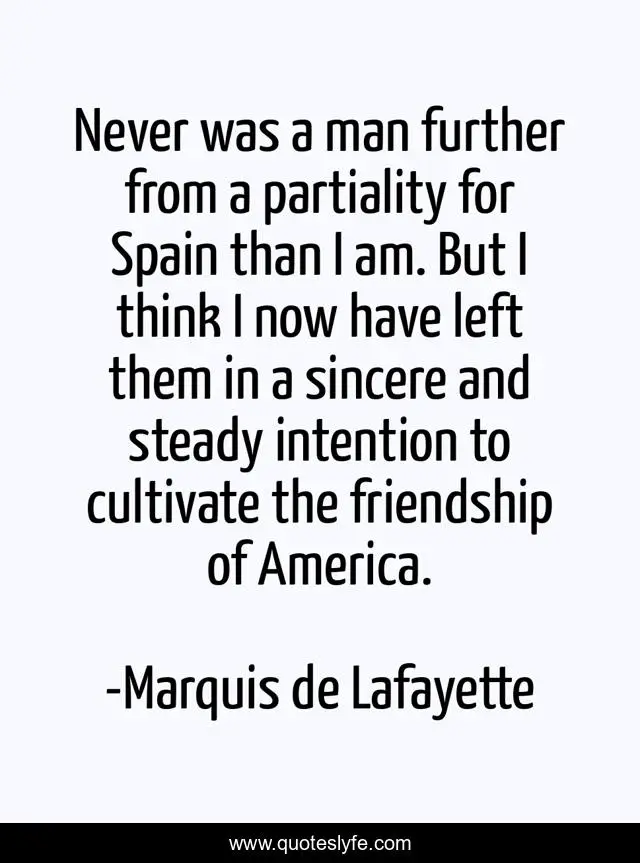 This page presents the quote "Never was a man further from a partiality for Spain than I am. But I think I now have left them in a sincere and steady intention to cultivate the friendship of America.". Author of this quote is Marquis de Lafayette. This quote is about america, man,.