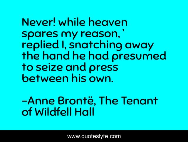 This page presents the quote "Never! while heaven spares my reason, ’ replied I, snatching away the hand he had presumed to seize and press between his own.". Author of this quote is Anne Brontë, The Tenant of Wildfell Hall. This quote is about reason, morals,.
