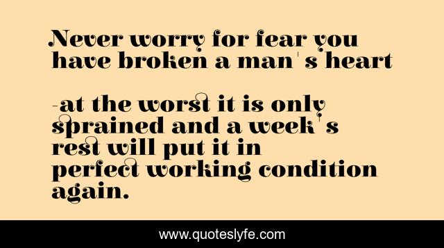 This page presents the quote "Never worry for fear you have broken a man's heart". Author of this quote is at the worst it is only sprained and a week's rest will put it in perfect working condition again.. This quote is about helen rowland, a guide to men: being encore reflections of a bachelor girl,.