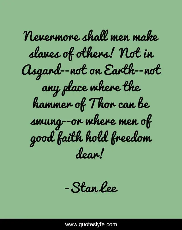 This page presents the quote "Nevermore shall men make slaves of others! Not in Asgard--not on Earth--not any place where the hammer of Thor can be swung--or where men of good faith hold freedom dear!". Author of this quote is Stan Lee. This quote is about freedom, slave, slavery, slaves, thor,.
