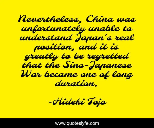 This page presents the quote "Nevertheless, China was unfortunately unable to understand Japan's real position, and it is greatly to be regretted that the Sino-Japanese War became one of long duration.". Author of this quote is Hideki Tojo. This quote is about real, understand, long,.
