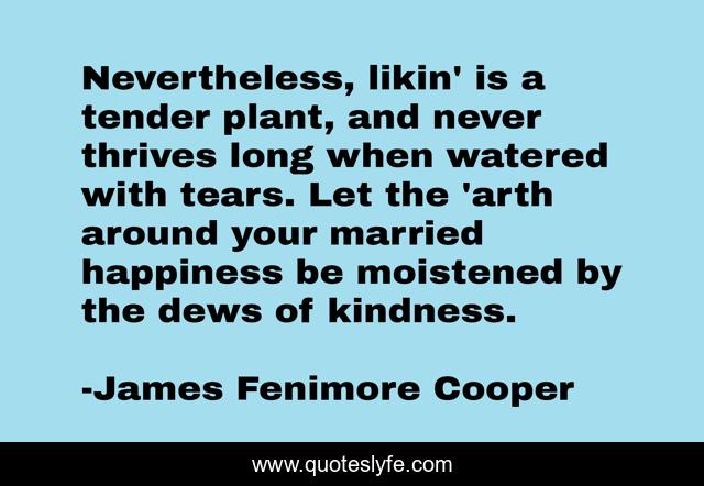 This page presents the quote "Nevertheless, likin' is a tender plant, and never thrives long when watered with tears. Let the 'arth around your married happiness be moistened by the dews of kindness.". Author of this quote is James Fenimore Cooper. .